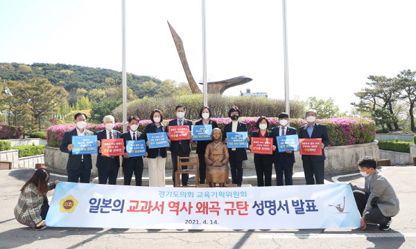 [프레스뉴스] 강보선 기자= 4월 14일(수) 경기도의회 교육기획위원회 위원장 정윤경 의원과 교육기획위원회 의원들은 경기도의회 소녀상 앞에서 독도는 일본의 고유 영토이며, 한국이 불법점거하고 있다’고 기재한 고교 사회과 교과서 8종의 검증을 통과시킨 일본의 역사 왜곡을 규탄하는 성명서를 발표하였다.
