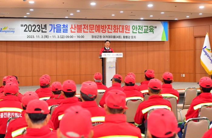 | ▲장성군 산불예방 안전교육 현장. 단상 위 김한종 군수(사진제공=장성군) |