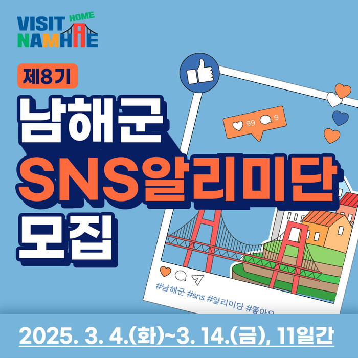 | ▲남해군(군수 장충남)은 '2025 고향사랑 방문의 해'를 맞아 지역의 다양한 소식과 관광 명소, 축제 등을 널리 알리기 위해 제8기 SNS 알리미단을 모집한다. (사진=남해군) |