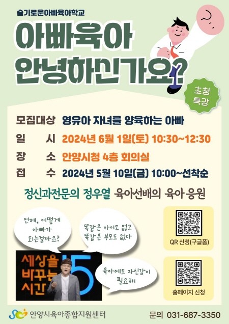 교육대상 및 인원은 영유아의 남성 양육자 100명이며, 교육신청은 오는 10일 오전 10시부터 안양시육아종합지원센터 홈페이지에서 할 수 있다.