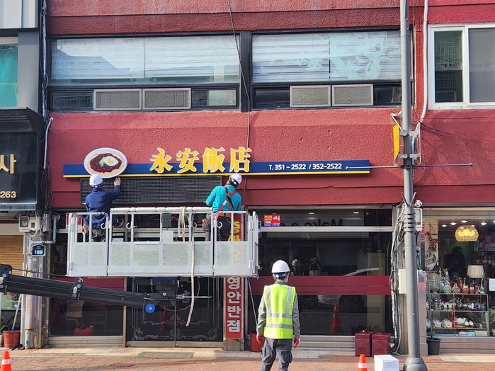 ▲낡은 간판을 새로운 디자인의 간판으로 개선하여 상가 이미지를 높이고 깨끗한 거리를 조성하고 있다. (사진제공=영광군) |