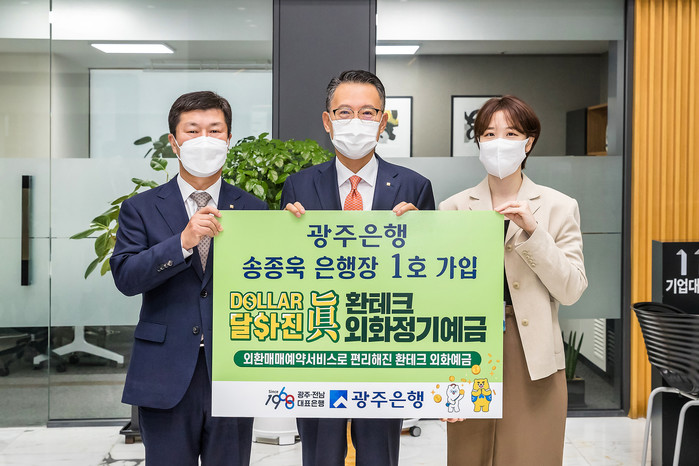 송종욱 광주은행장은 ‘달라진(DOLLAR 眞) 환테크 외화정기예금’ 출시를 기념해 1호 가입자로 나서며 “저금리 시대와 불안한 국제 경기 확산으로 안전자산 투자를 위해 미국달러 환테크에 관심이 높은 고객님들을 위해 편리한 환테크 기능을 추가한 ‘달라진(DOLLAR 眞) 환테크 외화정기예금’을 출시했으니 많은 관심과 성원 부탁드린다”고 말했다.