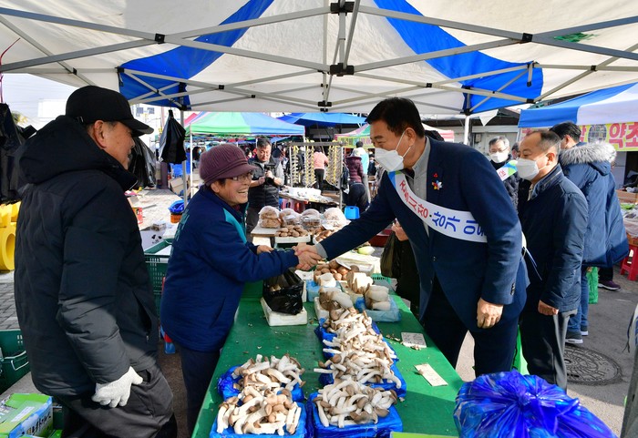 ▲장성군이 전국 기초단체장 공약실천계획서 평가에서 우수 등급을 획득했다. 올해 초 전통시장을 찾은 김한종 장성군수(사진제공=장성군) |