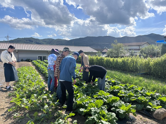 | ▲2024년 전남살아보기 참가자들이 배추밭에서 잡초를 뽑고 있다./보성군 제공 |