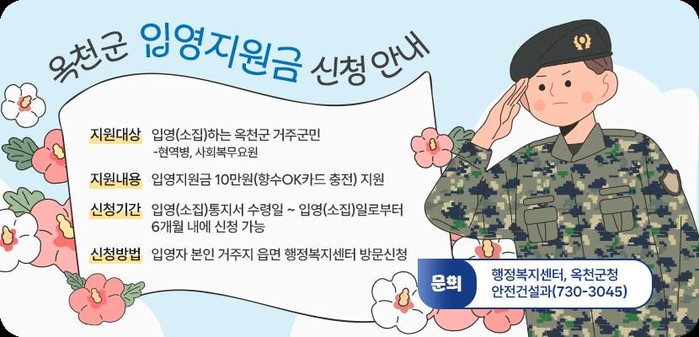 지원 대상은 신청일 기준 옥천군에 1년 이상 주민등록을 두고 거주하고 있으며 입영(소집)하는 현역병, 사회복무요원이다.