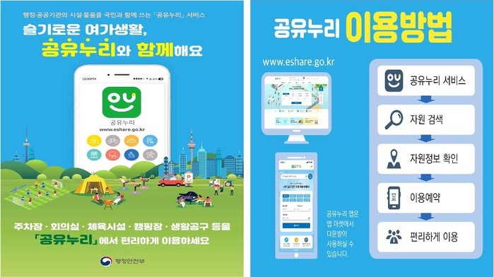 ‘공유누리’는 중앙행정기관, 지방자치단체, 공공기관 등 공공부문에서 국민에게 개방하는 시설이나 물품 등 공공개방자원을 온라인상에서 쉽고 편리하게 검색하고 예약할 수 있는 대국민 공공개방자원 공유서비스 포털이다.
