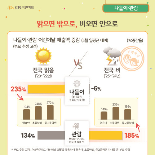 영유아, 초중고등학생 자녀를 둔 것으로 추정되는 부모들의 어린이날 날씨에 따른 소비 트렌드도 살펴봤다. 맑은 날에는 놀이공원, 동물원, 식물원 등 나들이 업종의 이용액이 235% 증가했다. 비 내리는 날에는 영화, 콘서트, 연극, 박물관 등 관람 업종의 이용액이 185% 증가하고, 나들이 업종 이용액은 5월 일평균 대비 6% 감소했다.
