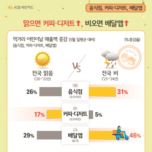 - 어린이날 날씨가 맑으면 커피와 디저트 매출 오르고, 비 오면 배달 증가