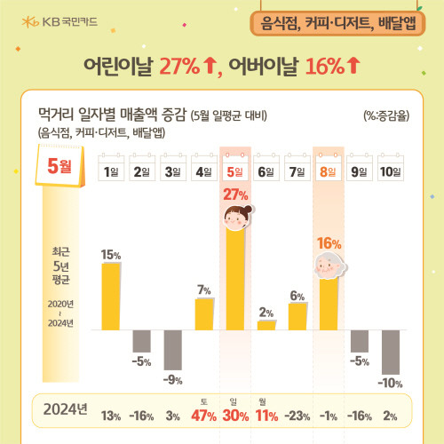 어린이날과 어버이날에 음식점과 커피, 디저트, 배달 업종 매출액은 최근 5년, 5월 일평균 대비 27%, 16% 증가했다. 어린이날은 최근 5년간 증가했지만, 어버이날은 공휴일이 아니었던 2023년과 2024년 2년 동안은 매출액이 소폭 감소했다.