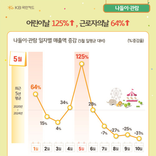 놀이공원, 동물원, 식물원, 영화관, 박물관 등 7개의 나들이와 관람 업종은 근로자의 날과 어린이날에 5월 일평균 대비 매출액이 크게 증가했다. 어린이날은 최근 5년 평균 125%, 근로자의 날은 64% 증가했다. 특히 대체공휴일이 있었던 지난해에는 연휴 1일차 114%, 2일차 83%, 3일차에도 31% 증가한 것으로 나타났다.