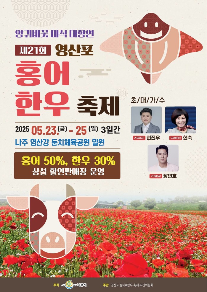 20일 나주시에 따르면 5월 23일부터 25일까지 3일간 영산포둔치 시민체육공원 일원에서 ‘제21회 영산포 홍어·한우축제’가 열린다.