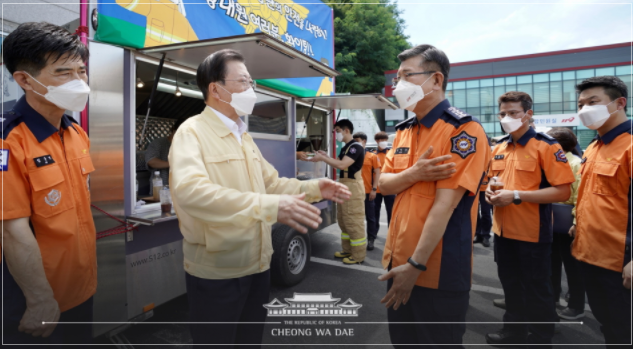 문 대통령은 “소방대원분들이 폭염에 취약한 쪽방촌이나 고지대, 축산농가 쪽에 살수를 하거나 생활용수를 공급하여 폭염 피해로부터 국민들을 지켜주고 있다”며 “거기에 코로나 확진자, 의심환자 등 방역을 위한 이송 지원에도 정말 수고가 많다”고 치하했다.