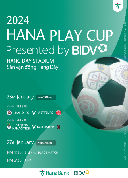 23일 오후 3시(현지시간) ‘하노이FC’와 ‘비엣텔FC’의 첫 경기를 시작으로 27일 오후 5시30분(현지시간) 결승전이 진행되며, 스카이스포츠를 통해 ‘대전하나시티즌’의 경기가 생중계되어 국내 축구 팬들도 생생하게 『BIDV 초청 하나플레이컵』을 즐길 수 있다.
