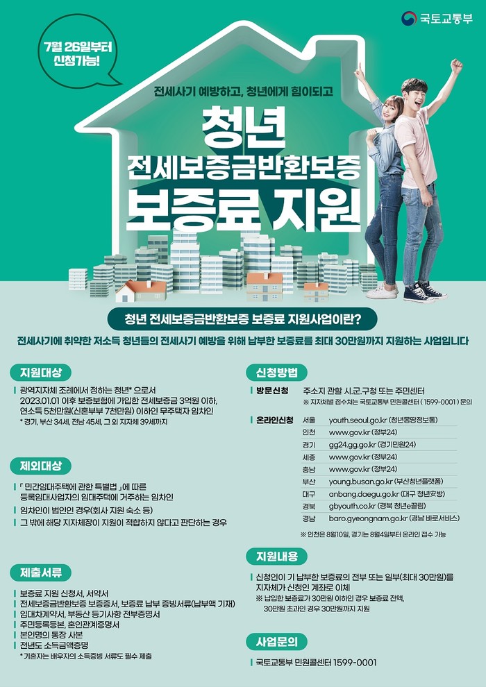 이번 보증료 지원사업은 전세사기에 노출될 위험이 상대적으로 큰 청년과 신혼부부의 전세보증금 반환보증 가입을 유도하기 위한 것으로 청년 임차인이이미 납부한 보증료를 최대 30만 원까지 지원한다.