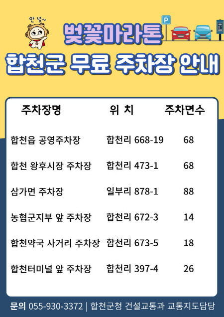 주차장 무료 개방과 관련한 자세한 사항은 합천군 건설교통과 교통지도담당(055-930-3371~3)으로 문의하면 된다.