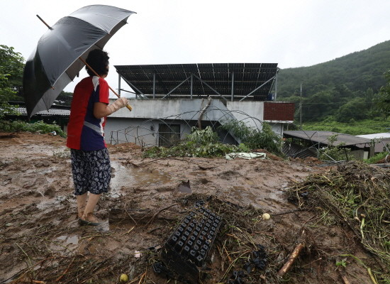 | ▲18일 경북 예천군 용문면 사부2리에서 한 주민이 흘러내린 토사로 접근이 어려워진 집을 바라보고 있다.(사진= 뉴스1) |