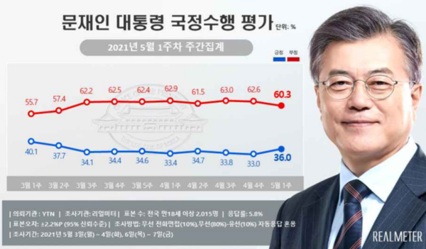 10일 리얼미터가 YTN 의뢰로 진행한 5월 1주차 여론조사 결과를 보면 문 대통령의 국정수행 지지율(긍정평가)은 36.0%로 지난주보다 3%p 올랐다. 부정평가는 2.3%포인트 떨어진 60.3%로 집계됐다. '모름·무응답'은 3.7%였다.