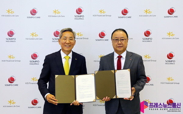 [프레스뉴스] 김대일 기자= KB금융그룹(회장 윤종규)은 8일 일본 도쿄 솜포홀딩스(SOMPO Holdings) 본사에서 윤종규 회장, 사쿠라다 켄고 솜포홀딩스 회장 등 양 사 임직원이 참석한 가운데 요양서비스 산업 발전을 위한 업무 협약(MOU)을 체결했다.