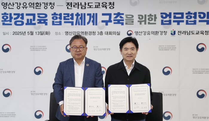 전라남도교육청(교육감 김대중)과 영산강유역환경청(청장 김영우)은 13일 영산강유역환경청 대회의실에서 ‘환경교육 협력체계 구축’을 위한 업무협약을 맺고, 학생과 전문가가 함께하는 실천 중심 활동에 협력하기로 했다.