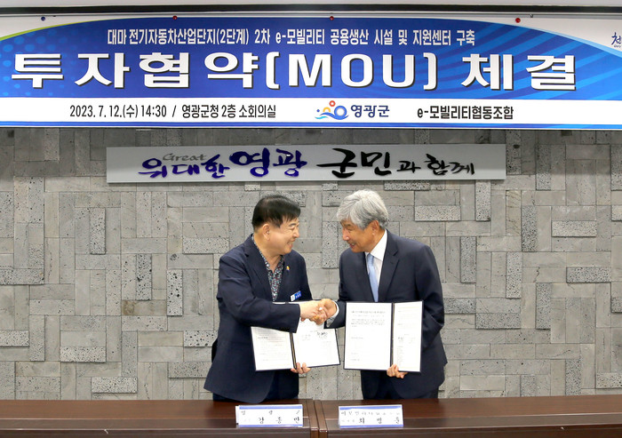 강종만 영광군수는 “이번 협약체결을 통해 대마 전기자동차산업단지 내 e-모빌리티 기업이 보다 성장하여 국내 뿐만 아니라 해외 수출까지 판로를 개척하여 관련산업과 지역경제가 더욱 발전하기를 기대한다.”며 “영광군 미래 먹거리산업 발전에 적극 지원하여 더 많은 우량기업을 유치하기 위해 노력하겠다.”고 밝혔다.