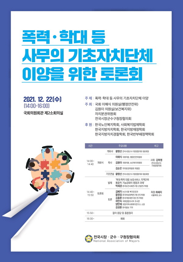| ▲ 폭력·학대 사무 기초단체 이양 토론회 개최 포스터(사진=전국시장군수구청장협의회) |