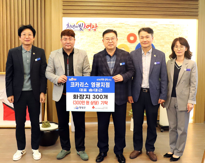 | ▲코카리스 영광지점은 화장지 300개(300만 원 상당)을 영광군에 기탁했다.(사진제공=영광군) |