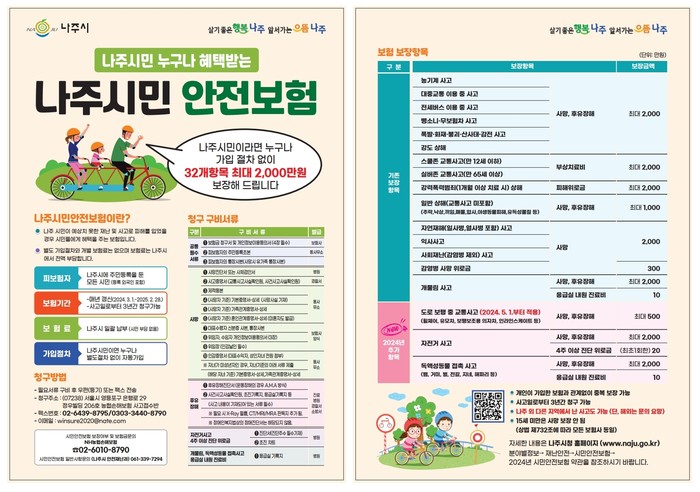 윤병태 나주시장은 “예기치 못하지만 일상에서 빈번히 발생하는 재난·사고에 대비해 시민안전보함 보장 범위를 매년 확대하고 있다”며 “적극적인 홍보와 더불어 재난 대비, 사고 예방을 위한 사회 안전망 구축에도 최선을 다하겠다”고 전했다.