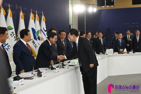 | ▲ 27일 경북도청에서 열린 제5회 중앙지방협력회의에서 윤석열 대통령과 김동연 지사가 인사를 나누고 있다.(사진=경기도) |