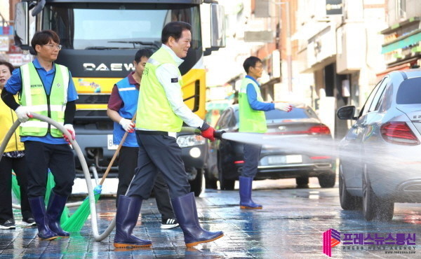[프레스뉴스] 장현준 기자= 안양시는 추석 명절을 앞두고 4일 오전 9시 댕리단길(만안구 안양로329번길) 합동 물청소를 실시했다.