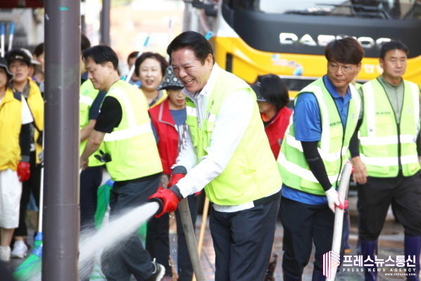 시 직원 등은 고압살수차량을 이용해 거리의 오래된 오염원 제거에 나섰고, 단체 참여자들은 담배꽁초 등 쓰레기 수거, 진열대·벤치 등 시설물 정리 등을 실시했다.