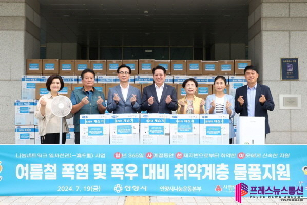[프레스뉴스] 장현준 기자= 안양시와 안양시나눔운동본부는 19일 오전 10시 시청 정문에서 ‘일사천리 지원사업’으로 주거취약계층 대상 폭염·폭우 대비 물품 전달식을 가졌다.