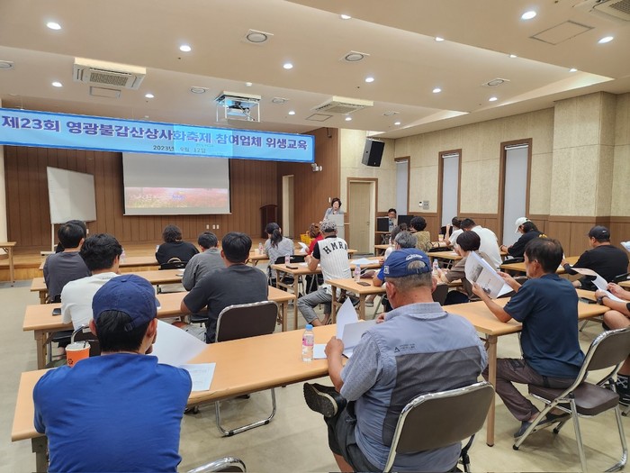 ▲제23회 영광불갑산상사화축제의 성공적인 개최 및 안전하고 위생적인 축제 먹거리를 위해 축제참여 식품접객업 영업자를 대상으로 위생교육을 실시했다.(사진제공=영광군) |