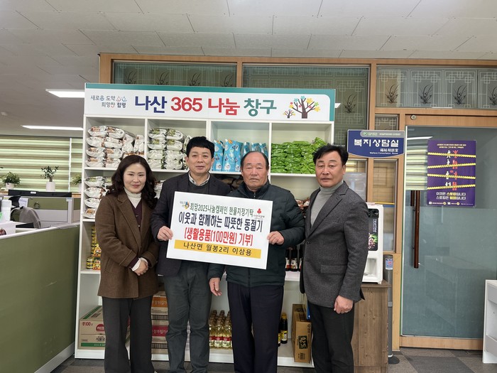 함평군 나산면은 14일 “나산면 월봉2리 주민 이삼용씨가 지난 13일 식용유, 세탁세제 등 100만원 상당의 생활용품을 ‘나산365 나눔창고’에 기부했다”고 밝혔다.