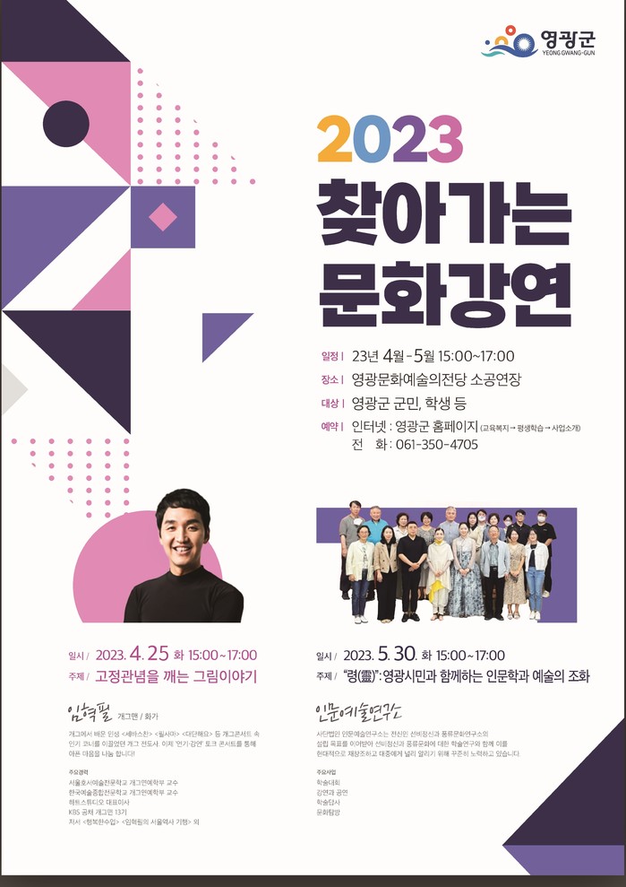 [전남=프레스뉴스] 차윤기 기자= 전남 영광군은 오는 25일 영광문화예술의전당 소공연장에서 찾아가는 문화강연을 개최한다. 이번 강연은 임혁필 개그맨이 ‘고정관념을 깨는 그림이야기’라는 주제로 강연할 예정이다.