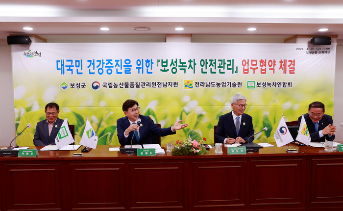 [전남=프레스뉴스] 강래성 기자= 보성군과 국립농산물품질관리원 전남지원(지원장 방도혁, 이하 농관원 전남지원)은 26일 전라남도 농업기술원(원장 박홍재), 보성녹차연합회(회장 박동호)와 함께 보성군청 소회의실에서 대국민 건강 증진을 위한 ‘보성녹차 안전관리’ 업무 협약을 체결했다고 밝혔다.