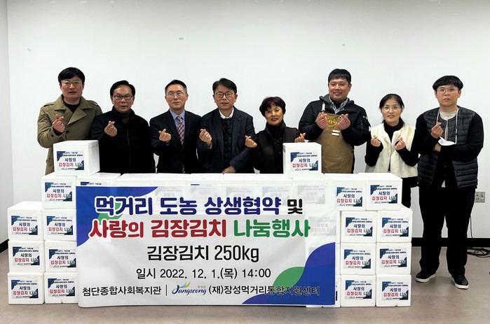 이날 (재)장성먹거리통합지원센터와 첨단사회종합복지관은 ‘먹거리 안전망 구축을 위한 업무협약’을 통해 상생 협력의 뜻을 한 데 모았다. 협약식 이후에는 김장 김치 250kg을 광주 첨단 주민에게 전달하는 시간도 가졌다.