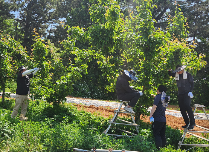 | ▲농촌일손돕기-배 열매솎기 작업(사진제공=영광군) |