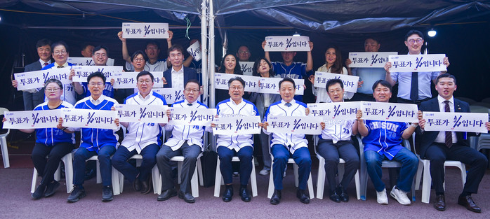 강기정 광주광역시장이 28일 오후 조선대학교 대동제 'GRACIA' 행사에 참석해 김이수 학교법인 이사장과 김춘성 총장, 임채효 총학생회장 등 내빈들과 투표 독려 캠페인을 벌이고 있다.