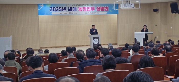 [전남=프레스뉴스] 강래성 기자= 순천시(시장 노관규)는 지난 16일 혁신농업인센터 강당에서 농업인과 농업 관련 기관 임직원 등 150여 명이 참석한 가운데 2025년 새해 농정업무 설명회를 가졌다.