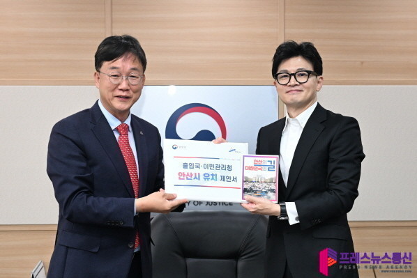 [프레스뉴스] 장현준 기자= 안산시(시장 이민근)는 지난 27일 정부과천종합청사에서 이민근 시장이 한동훈 법무부장관을 만나 출입국·이민관리청(이하 이민청) 유치 제안서를 전달했다고 28일 밝혔다.