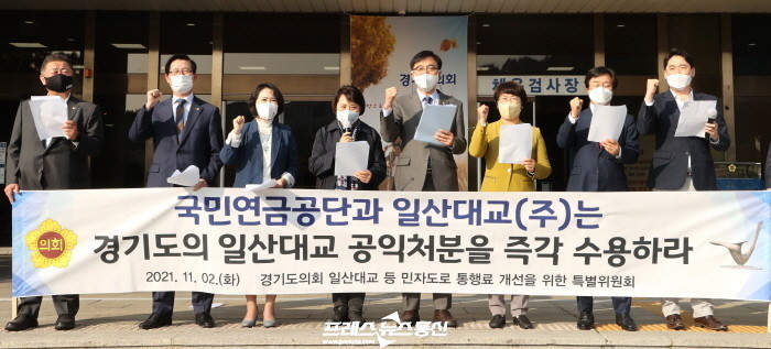 | ▲ 경기도의회 일산대교 특별위원회, 국민연금공단ㆍ일산대교(주), 일산대교 공익처분 수용하라!(사진=경기도의회) |