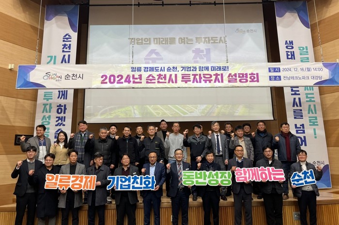 [전남=프레스뉴스] 강래성 기자= 순천시(시장 노관규)는 지난 16일 율촌1산단 전남테크노파크 대강당에서 기업 대표 등 관계자 100여 명이 참석한 가운데 ‘2024년 순천시 투자유치 설명회’를 성황리에 마쳤다고 밝혔다.