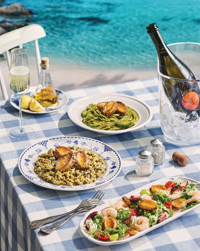 완도 전복을 활용한 신메뉴는 크림 리조또에 버터로 구운 완도 전복을 올리고 전복 소스를 더해 감칠맛을 살린 리조또와 부드럽고 쫄깃한 식감의 완도 전복과 문어, 새우 등 다양한 해산물과 청포도, 레몬 비네거 드레싱이 어우러진 샐러드이다.