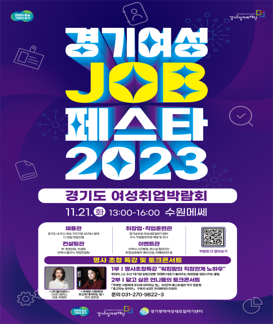 ‘경기여성 잡페스타’ 행사와 관련한 자세한 사항은 경기도 여성가족국 고용평등과, 경기도일자리재단 남부사업본부 남부일자리팀으로 문의해 안내받을 수 있다.