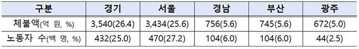 이번 발표에 따르면 경기도가 3540억 원(4만 3200명)으로 체불 규모가 가장 크며, 서울시가 3434억 원(4만 7000명)으로 두 번째를 차지했다.