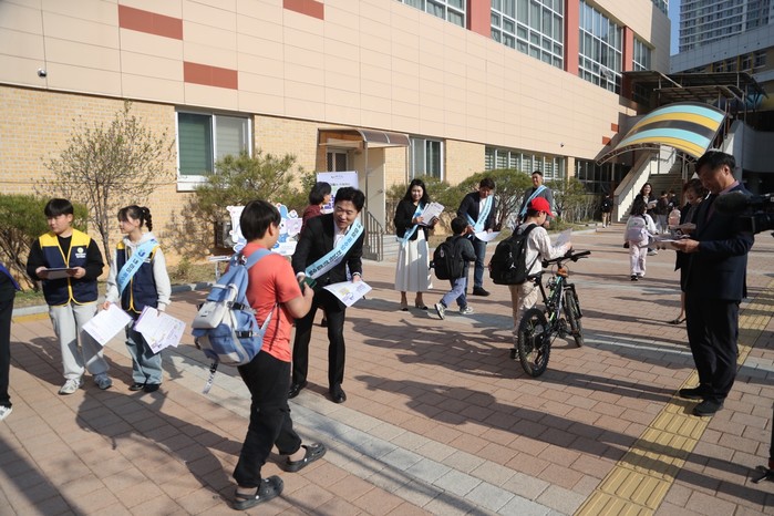 | ▲전남교육청 관계자들이 등교하는 신대초등학교 학생들에게 전남학생교육수당 활용법 리플릿을 나눠주고 있다./전남교육청 제공 |