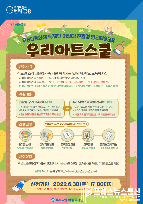 [프레스뉴스] 김대일 기자= 우리금융그룹 우리다문화장학재단(이사장 손태승)은 2022년 친환경 창의미술교육 ‘우리아트스쿨’에 참여할 다문화가족 지원기관을 모집한다고 17일 밝혔다.