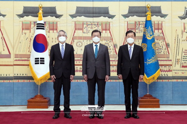 ▲ 문 대통령이 14일 청와대 본관에서 열린 아이보시 고이치 주한대사 신임장 제정식에서 기념촬영을 하고있다. 오른쪽은 정의용 외교부 장관.(사진= 청와대) |
