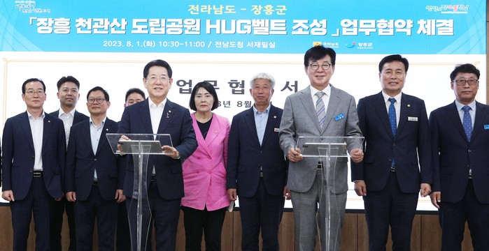 [전남=프레스뉴스] 강래성 기자= 전라남도는 1일 도청 서재필실에서 장흥 천관산 도립공원 H·U·G벨트 조성사업의 성공적 추진을 위해 장흥군과 업무협약을 했다.