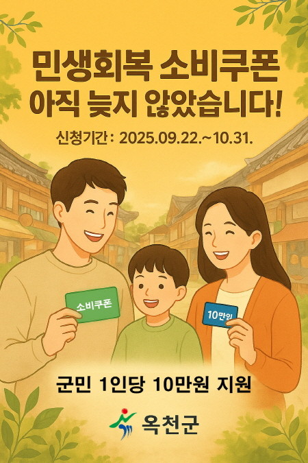 이번 2차 소비쿠폰은 소득 상위 10%를 제외한 모든 군민에게 1인당 10만원 씩 지급되며 신청은 오는 31일까지 본인 명의의 신용·체크카드, 옥천사랑상품권(향수OK카드)으로 신청 하면된다.